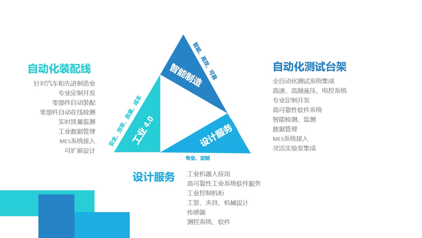 在自動化裝配線領域,為客戶提供定制化的、高性價比的解決方案。在智能傳感器、機器人應用等領域具有技術優勢,幫助客戶提高產品質量、提高生產效率、降低生產成本和強化安全。在自動化測試臺架領域,在高速、高頻的電控和液壓測試系統方面具有豐富的經驗,為客戶提供全面的自動化測試系統解決方案。